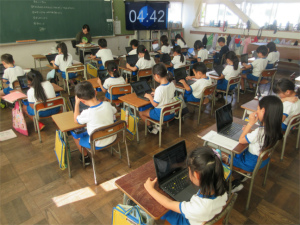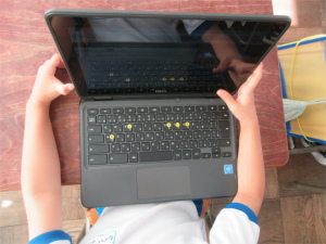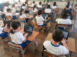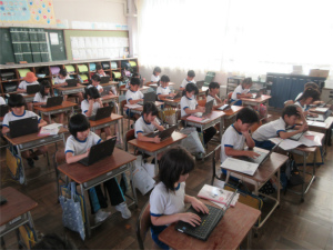 入力表とにらめっこしている子もいれば、画面に表示される言葉を次々とローマ字で入力する子もいます。