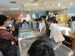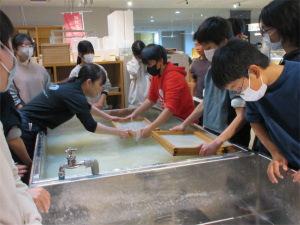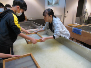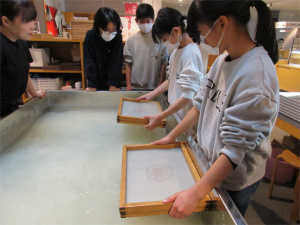 6年生は今日、卒業証書の紙漉き体験とジュニアキッチンの体験のため食文化館へ。