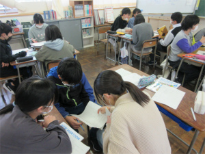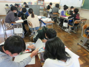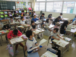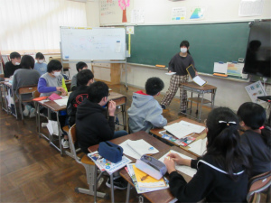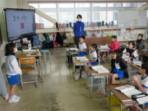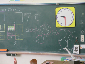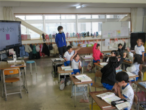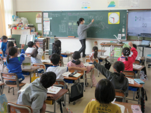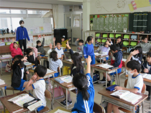 1年生は問題が出されると「ハーイ、ハーイ…」と一斉に手が挙がります。「ねえねえ、わたし1回も当たっていないんや。」と主張する子もいて、とても元気で明るい授業が展開されました。